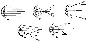 The spread of light will be at top efficiency only if the bulb is precisely the right distance from the reflector. How the rays of light are thus affected is depicted in figure 68. The correct focal point for the lamp is shown by the dot (F). In example A the position of the bulb is just right. The result is even